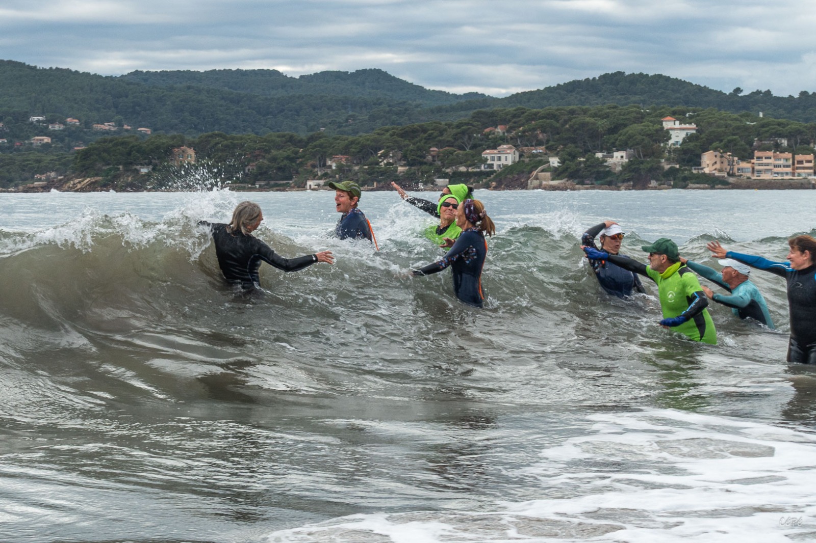 Le groupe, accueilli par deux animatrices, qui ont distribué à chacun combinaison et recommandations pour un habillage facile (facile, facile, c’est un peu vite dit !). Un mot de présentation des animatrices, Chantal REDON, championne de France en titre de Longe Côte dans sa discipline et Rosita FRONTERI, ex championne de France.