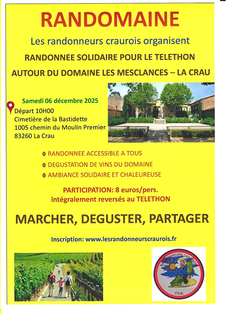 Samedi 6, nous vous proposons une Ran’domaine en collaboration avec le domaine Les Mesclances. Cette randonnée (9km et 170m de dénivelé) est ouverte à tous. Le nombre de participants est limité à 40 personnes. La participation est au minimum de 8€ à régler en espèces au départ de la rando. Merci d’apporter l’appoint. Ces 8€ représentent le coût de la dégustation au Domaine Les Mesclances ; lequel propose de reverser intégralement les fonds récoltés pour le Téléthon.